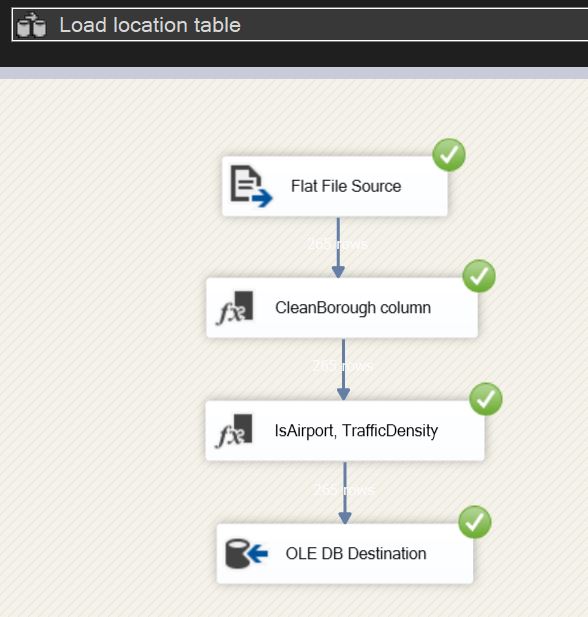 TrafficDensity => (DT_STR,20,1252)(CleanBorough == "Manhattan" ? "High" : (CleanBorough == "Brooklyn" || CleanBorough == "Queens" || CleanBorough == "Bronx" ? "Medium" : "Low"))3. Data Flow: Fact Table