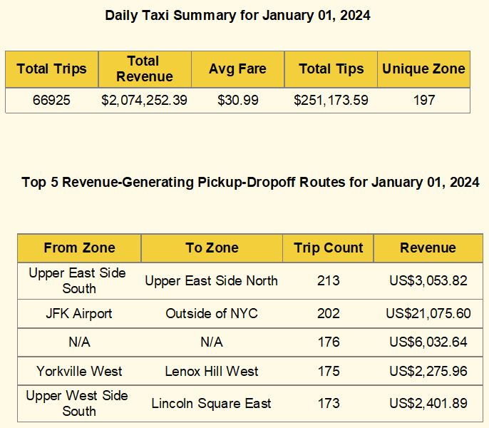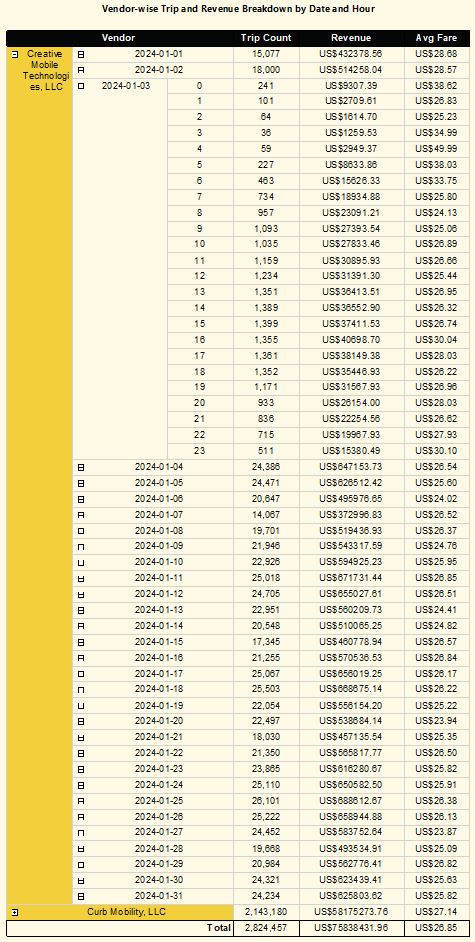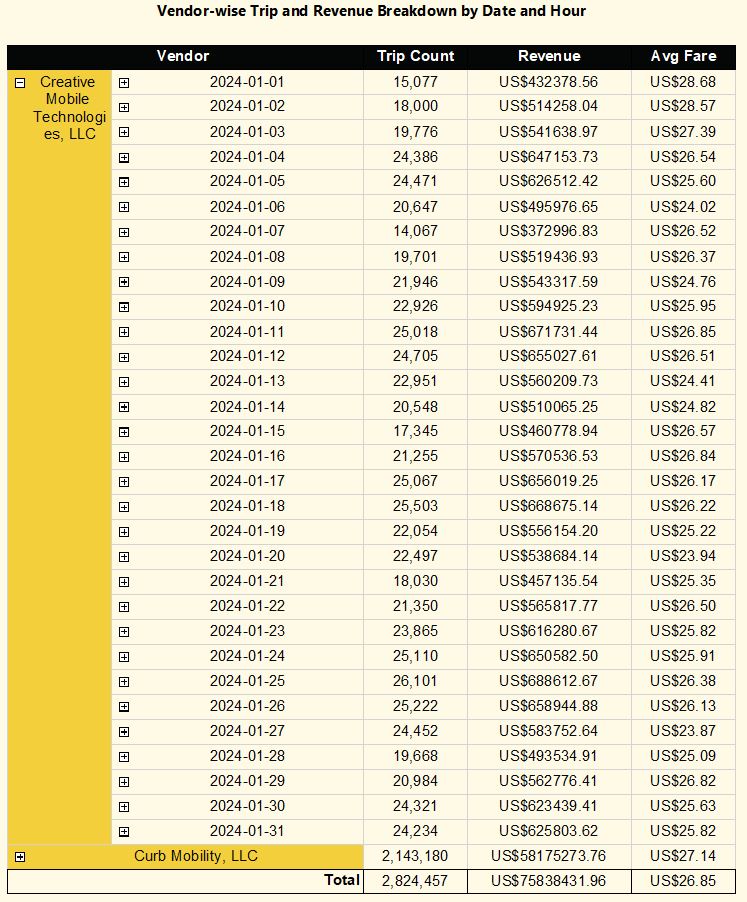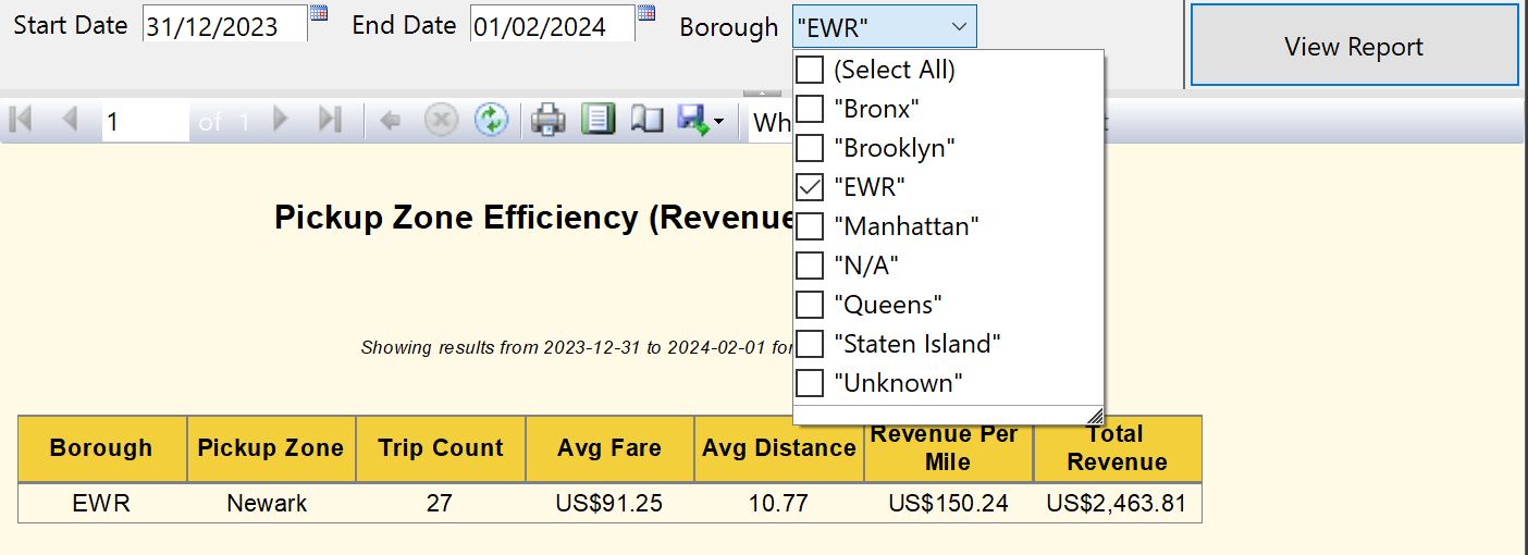 Beyond standard tables, I utilized different SSRS data regions (Matrix and Sub-reports) to provide diverse perspectives on the taxi operations: