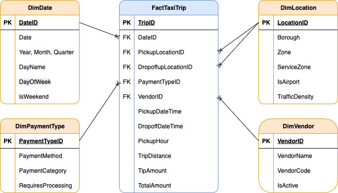 I designed a central Fact Table (FactTaxiTrip) connected to four specialized Dimensions. This structure allows stakeholders to filter millions of rows by Vendor, Location, Payment Type, or Date in milliseconds.